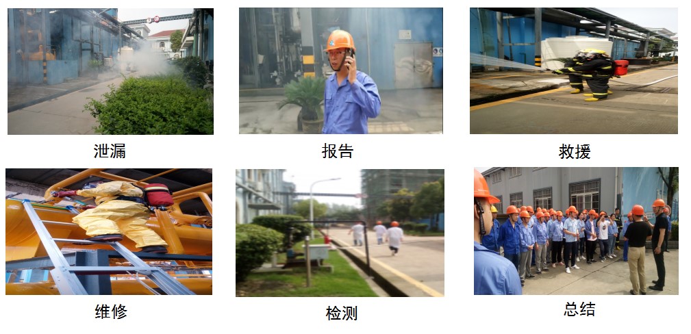 6月27日上午約9點(diǎn),中控室陳雙燕發(fā)現(xiàn)冷凍崗位的液氨儲(chǔ)槽有毒氣體探頭發(fā)生報(bào)警,遂通知陳欽宗趕往現(xiàn)場進(jìn)行檢查。陳欽宗在檢查后發(fā)現(xiàn),高壓儲(chǔ)氨器處發(fā)生大量泄漏,立即用對講機(jī)告知硝化操作工冷凍高壓儲(chǔ)氨器發(fā)生泄漏需停車后檢查自動(dòng)噴淋設(shè)施是否正常開啟,并告知另外操作工吳麗忠前往中控室進(jìn)行一鍵停車操作;硝化操作工在接到冷凍泄漏情況的報(bào)告后,立即用對講機(jī)向工段長報(bào)告;工段長倪佰泉在接到報(bào)告后,告知硝化內(nèi)操人員進(jìn)行緊急停車操作后,并向現(xiàn)場指揮田園報(bào)告硝化停車原因;現(xiàn)場指揮田園經(jīng)現(xiàn)場確認(rèn),因氨泄漏無法及時(shí)控制,可能波及周邊人員,遂向總指揮報(bào)告,并請求啟動(dòng)公司應(yīng)急預(yù)案;總指揮在接到事故報(bào)告后,宣布立即啟動(dòng)應(yīng)急預(yù)案,現(xiàn)場指揮田園在得到啟動(dòng)應(yīng)急預(yù)案的命令后,通知指揮部成員(副總指揮);然后總指揮、副總指揮和現(xiàn)場指揮立即分別對各職能小組下達(dá)命令。……經(jīng)過一系列的救援、維修、檢測等,最后把事故處理后的結(jié)果匯總到總指揮處。通過應(yīng)急預(yù)案的演練,檢查公司各應(yīng)急小組之間的協(xié)調(diào)能力,使得公司各應(yīng)急小組之間的配合進(jìn)一步熟練,使得應(yīng)對突發(fā)狀況的能力進(jìn)一步提高。